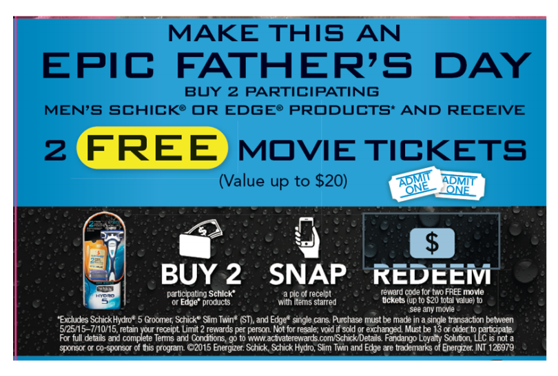 BUY: Purchase 2 participating Men’s Schick® or Edge® products in a single transaction between 5/25/15 and 7/10/15. Retain your receipt.